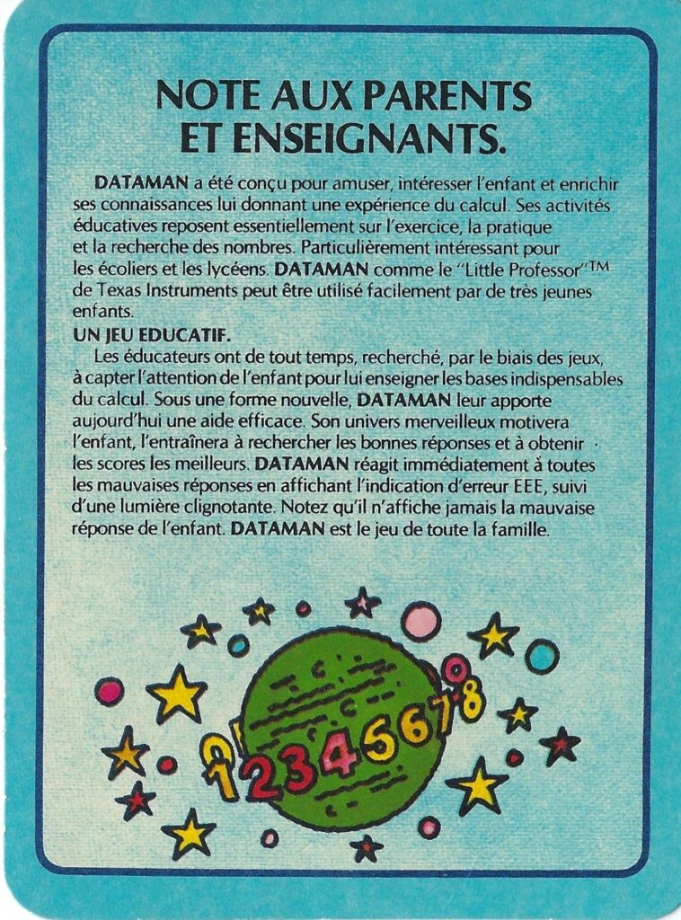 Little professor et Dataman sont accompagnés de livrets pédagogiques. Ils sont disponibles sur le site Datamath.org. Par exemple, le livret d’utilisation Dataman est disponible ici et un livret « d’aventures » est disponible ici. Le livret d’accompagnement du Little professor 1976 est disponible ici.